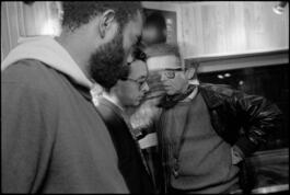 FRANCE. Ile-de-France region. Essonne departement. Yerres. Studio Gimmick, 63 rue Charles de Gaulle. Recording of the CD "La Note Bleue". From left to right : US jazz musician Sangoma EVERETT (drums, percussions), Italian jazz musician Riccardo DEL FRA (double bass) and French jazz musician Barney WILEN (tenor and soprano saxophones). Monday, December 1st 1986, between 10 p.m. and 1 a.m.