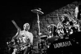 FRANCE. Alsace region. Haut-Rhin department. Mulhouse. "Jazz a Mulhouse" Festival. Dutch jazz musician Han BENNINK (drums) US jazz musician David MOSS (drums, vocals). During the concert at 00:00. BENNINK and MOSS DUO. Saturday 28th August, 1993.