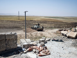 SYRIA. Tel Hama. May 19, 2015. A tank belonging to the Kurdish YPG militia parked at the edge of the front line village if Tel Hama the morning after heavy coalition bombardment forced the retreat of Islamic State fighters who were in control of the village.