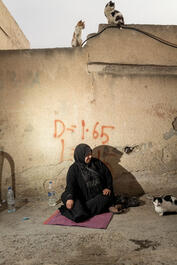 Hanan was sitting feeding cats in an alleyway of the Madaba Palestinian refugee camp in Madaba, Jordan.
