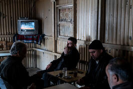 Palestinian men living in the Souf refugee camp play cards inside an old coffee shop in the camp.