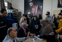 Residents of the Amman New Palestinian refugee camp gather at the local Palestinian Affairs Office to claim food voucher assistance donated by King Hussein’s Jordanian Royal Court.