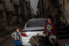 6 year-old Sham Abed Kalash (left), 3 year-old Jilani, and 12 year-old Mohammed, siblings from a Palestinian refugee family living in the Irbid Camp for Palestinian refugees, stand next to one of their family’s goats.