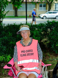 USA. Florida. Fort Pierce. September 9, 2024. Pat and Kent, two pro-choice abortion clinic escorts doing voluntary work in front of the "A Woman's World" abortion clinic in Fort Pierce. Their task is to protect the women who are entering the clinic from the harassment of the pro-life protesters that camp in fron of the clinic.