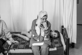 8 year-old Hazam curls behind his mother Eman in a hospital bed at MSF’s Reconstructive Surgery Hospital.
