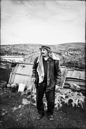 PALESTINE. Nablus. Rujib. 13 February 2024. Hajji Ghaleb, a relative of my father, stands on the land where he and his friends have spent their days for years. Nearby, Israeli settlers and soldiers gradually encroach, seizing more land to expand the illegal settlement of Itamar. What was once familiar ground is now slipping away, piece by piece.