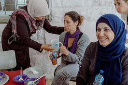 PALESTINE. Tulkarem. 2017. Jewish women medical staff from the PHR (Physicians for Human Rights) NGO offer free medical service to Palestinians near Tulkarem in Palestine. A mug is offered as a momento to the Jewish medical staff.