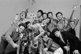 FRANCE. Provence-Alpes-Cote d'Azur region. Hautes-Alpes department. Orcieres-Merlette. Sport Arena. 2nd edition of the Orcieres Jazz Festival. "QUOI DE NEUF DOCTEUR". In the backstage, photo posing before going on stage for the evening concert in the 1st part. Sunday 18th January, 1987.