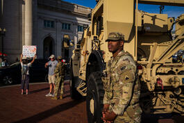 USA. Washington, D.C. August 31, 2025. National Guard members and protestors outside Union Station.