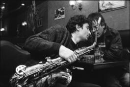 FRANCE. Provence-Alpes-Cote d'Azur region. Hautes-Alpes department. Orcieres-Merlette. Le Mash-Poor restaurant. 2nd edition of the Orcieres Jazz Festival. On the left, French jazz musician Guillaume NATUREL (saxophones). During the jams, after the evening concerts. Wednesday 21st January, 1987.