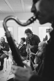 FRANCE. Pays de la Loire region. Sarthe departement. Le Mans. Europa Jazz Festival. Etablissements Bonvalet, piano repair, 163 rue Nationale. In the background, from left to right : Italian jazz musician Gianluigi TROVESI (clarinets), French jazz musicians Véronique ROIGNANT (clarinets), Louis SCLAVIS (clarinets), Jacques DI DONATO (clarinets). In the foreground, French jazz musician Armand ANGSTER (clarinets). Rehearsal for the concert on monday May 1st at the Epau Abbey. LOUIS SCLAVIS CLARINETTES SPECIAL PROJECT. Saturday, April 29th 1989.