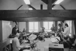 FRANCE. Pays de la Loire region. Sarthe departement. Le Mans. Europa Jazz Festival. Jacques Prévet Center, 97 Grande Rue. In the foreground, from left to right : a back view of US jazz musicians Paul MOTIAN (drums) and of John ABERCROMBIE (guitar). In the background, from left to right : French jazz musician Henri TEXIER (double bass), Italian jazz musician Aldo ROMANO (drums), US jazz musicians Steve SWALLOW (bass), Kenny WHEELER (trumpet), Bill FRISELL (guitar) and Joey LOVANO (saxophones). Rehearsal for the concert on saturday 29th at the Palais des Congrès. HENRI TEXIER OKTOKALEIDOSKOP PROJECT : HENRI TEXIER TRANSATLANTIK - PAUL MOTIAN TRIO - JOHN ABERCROMBIE. Thursday, April 27th 1989.