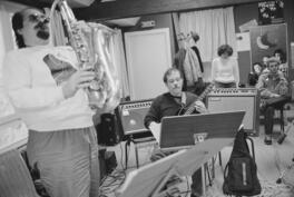 FRANCE. Pays de la Loire region. Sarthe departement. Le Mans. Europa Jazz Festival. Jacques Prévet Center, 97 Grande Rue. In the foreground, from left to right : US jazz musicians Joey LOVANO (saxophones) and John ABERCROMBIE (guitar). Rehearsal for the concert on saturday 29th at the Palais des Congrès. HENRI TEXIER OKTOKALEIDOSKOP PROJECT : HENRI TEXIER TRANSATLANTIK - PAUL MOTIAN TRIO - JOHN ABERCROMBIE. Thursday, April 27th 1989.