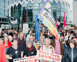POLAND. Warsaw. 19 July 2025. “Stop fascism. Migrants welcome" demonstration against racism and xenophobia in response to the anti-immigrant protests taking place across the country. Banners say: I'm your sister (up) everyone is welcome ( down)