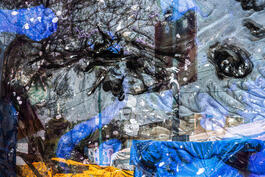 The migrant camp set up in front of the Senate of the Republic in Mexico City. Intervened photography.