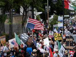 USA. California. LA. June 14, 2025. No Kings day protest in downtown Los Angeles.