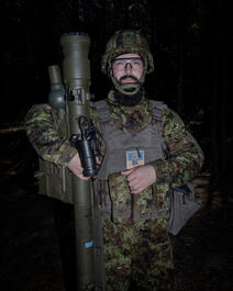 ESTONIA. May 21, 2025. Conscript posing for portrait after finished air defense fire excercise. Operation Hedgehog 2025 a large-scale international military exercise led by the Estonian Defence Forces. One of the largest military exercises in Estonia's history, involving over 16,000 troops from various NATO allies. The exercise focuses on training key tasks of Estonian and regional defense plans, enhancing interoperability between allied units, and testing rapid deployment and combat readiness.