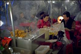 Korea. Seoul. Hardy citizens enjoy outdoot eating protected only by plastic sheeting even in midwinter temperatures. 2007