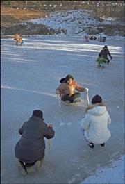 Korea. Ganghua Island (Kanghwa). People of all ages enjoy a Korean form of sledging on a frozen pond. 2007