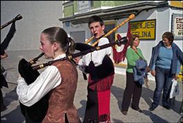 Spain. Galicia. Camarinas. This small town is the centre of lace-making in Galicia and puts on an annual festival. Here a traditional bagpipe band of young players tours the streets plaing traditional tunes.