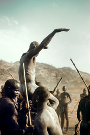 Africa. Sudan. South Kordofan state. 1949. The Nuba people. Korongo Nuba wrestler champion. The champion of a Korongo Nuba wrestling match is carried shoulder high, what is known as the chairing of the victor.