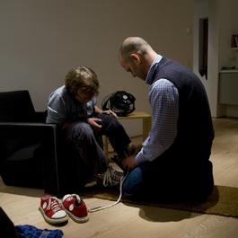 GB. England. Dungeness, Kent. Christmas with Peter Marlow's family at The Experimental Staion, Dungeness, the family weekend home. Felix tries on his new ice skates. 2008.