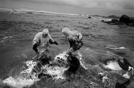 SPAIN. Galicia. Muxia. 2002. Oil spilling out from the tanker, the Prestige, which split in half and sank off the Spanish shore, washes up on the pristine coastline of Galicia. Here volunteers at Muxia are overwhelmed by the incoming tide while trying to clean the oil off the rocks and beach.
