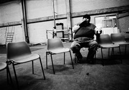GB. London. Crisis at Christmas. A warehouse in south-east London offers shelter for about 800 homeless men and women for eight days over the Christmas period. It is staffed by volunteers. One volunteer takes a break, prior to the arrival of the 'guests'. December 1990.