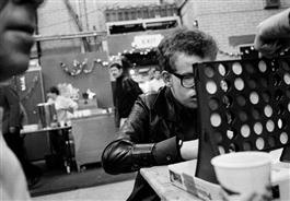 GB. London. Crisis at Christmas. A warehouse in south-east London offers shelter for about 800 homeless men and women for eight days over the Christmas period. It is staffed by volunteers. 'Guests play Connect Four'. December 1990.