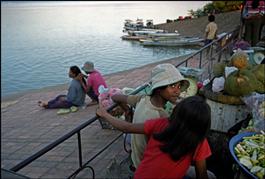 Cambodia. Angkor. West Baray. Children sell vegetables and fruit from a stall on the banks of the tank