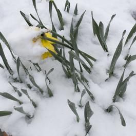 GB. England. Yorkshire, at the home of Fiona Naylor's sister, Ruth, during a snow fall in the New Year. Daffodils in the snow. 2008.