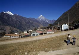 Nepal. Lukla. At 2,840 metres Lukla airstrip is one of the highest in the world. The runway is on a hillside to aid braking on landing and speed for take-off. Everest base camp trek. December 1988.