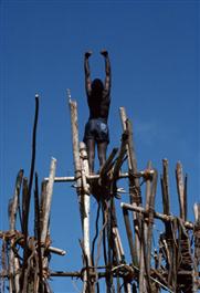 SOUTH PACIFIC. VANUATU. Pentecost. Land dive. As mark of manhood, men (and boys) throw themselves from a tall bamboo tower with nothing but vines attached to one leg. Thought to be the origin of bungee jumping. March 1989.
