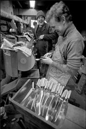 G.B. ENGLAND. Sheffield. A factory once famous for its steel cutlery now fitting handles to preformed imported blades. 1984.