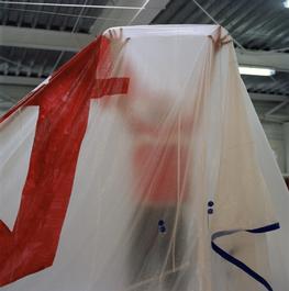 SPAIN.Valencia. The French Areva Challenge sail loft, the shore team prepare sails for practice.