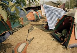 THAILAND. Phang Nga Province. Ban Muang Refugee Camp. A child, made homeless by the tsunami, leans out of her tent. 2005.