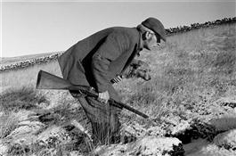 GB. England. West Yorkshire. Hebden Bridge. Lord Savile's Gamekeeper Frank Ideson. Foxes eat young grouse and are regarded as vermin by the keepers, who spend much of their time hunting them. Frank Ideson follows the fox's tracks, hoping to find the lair. To avoid confusing the tracks he carries his dog. 1976.