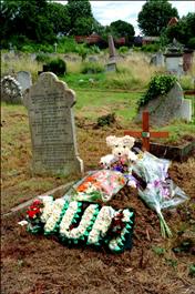 GB. London. Kensal Green Cemetery. At the Open Day many visitors walk around the cemetery itself to look at the graves of famous people and the mausoleums. Here a modern simple grave with a floral teddy bear and another floral tribute that spells mum. 2002.