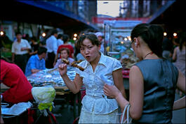 China. Xining. Two girls enjoy a snack at dusk in the Xining market and outdoor food stalls. 2006