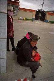 CHINA. Daheba. Tibetan family waiting for a ride in the cold...