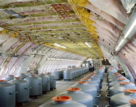 FRANCE. Toulouse. Airbus: Building the A380. The interior of first A380 to fly, following her successful maiden flight. The blue barrels contain water to simulate the weight of passengers and their luggage. April 2005.