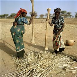 NIGER. Tajae. Woman separate millet grain from the chaff using wooden staves. Millet is the people's main staple. 2005.