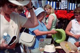 GB. ENGLAND. London. Women try on straw hats at a market stall. 2002.