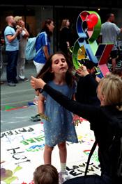 GB. ENGLAND. London. At a street fair local children enjoy a variety of hands on entertainment. Here a young girl who is in the middle of painting with her hands has her hair taken back by her mother so it doesn't fall into the wet paint. 2002.