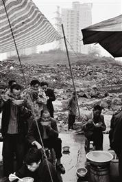 CHINA. Former farmers from rural areas turned construction workers break for lunch. The Chinese authorities estamate that 144 million have already left the land lured by the prospects of higher wages. As the impacts of climate change deepen, millions more farmers will be forced to leave the countryside. 2004.
