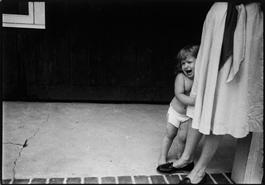 USA. Long Island. Miller Place. Crying child clutching mother's knee. 1956.