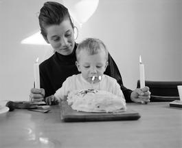 GB. London. Gee St. Max NAYLOR MARLOW's birthday. Fiona NAYLOR and Max NAYLOR MARLOW with the birthday cake. 1996.