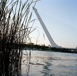 SPAIN. Seville. The Alamillo bridge across the Guadalquivir river...