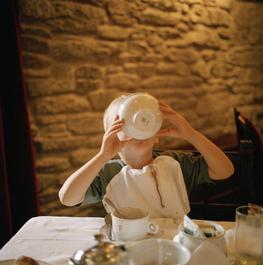 SPAIN. Galicia. Peter MARLOW and family on holiday. Felix having breakfast. 2003.