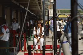 SPAIN. Barcelona. Formula One Women. Ex-Belgian lawyer, Marlene, wife of Emmanuele PIRRO, sits waiting for him to return to the pits during pre-qualifying. 1991.